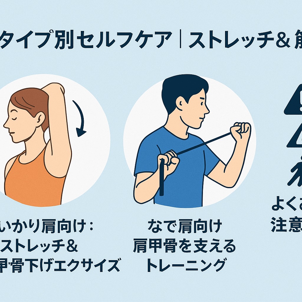 ここが一番知りたいポイントですよね。実は、肩タイプによって意識したい動きやアプローチが少し違うと言われています。ここでは、自宅で取り組みやすいセルフケアを、タイプ別に整理します。