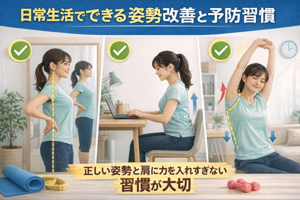 「気づくと肩が上がってるんだよね…」という声、よく聞きます。いかり肩の予防では、日常姿勢の積み重ねが大切だと言われています。
