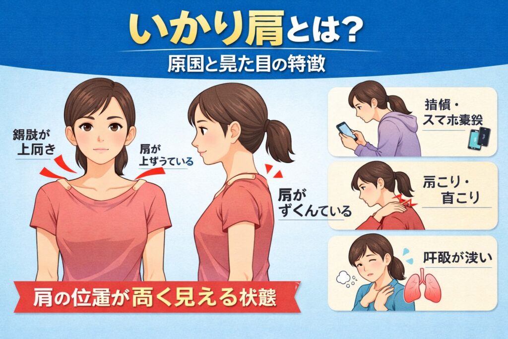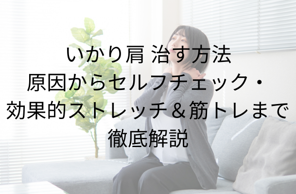 いかり肩 治すための完全ガイド。セルフチェック方法・原因・日常でできるストレッチ・筋トレ・姿勢改善のポイントを画像付きでわかりやすく解説します。
