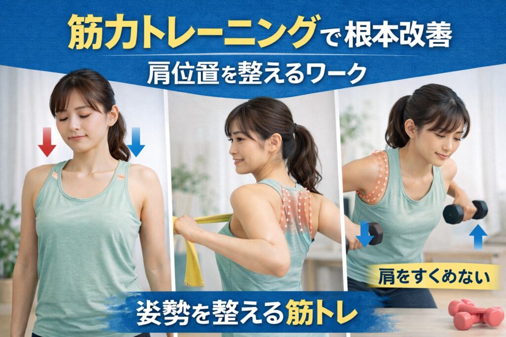 筋力トレーニングは、肩の位置を保ちやすくするサポート役として取り入れるのがおすすめです。無理のない回数から始め、体の変化を感じながら続けてみてください。