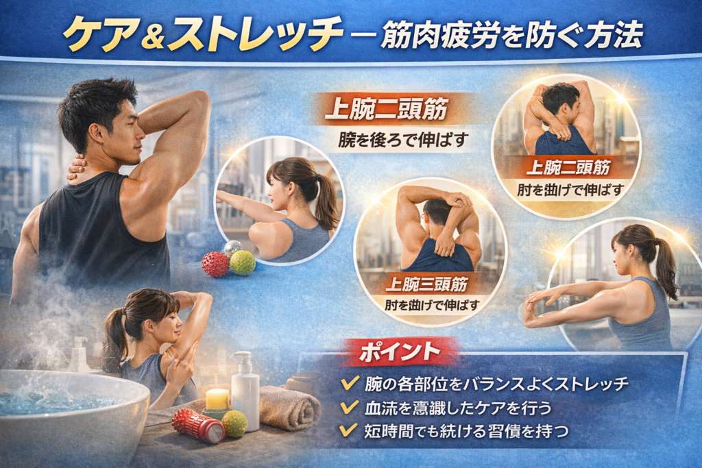 そう感じたら、うでのきんにくのケアを見直すタイミングかもしれません。鍛えるだけでなく、整えることで疲労感の軽減や次のトレーニングにつながると言われています。ここでは、部位別ストレッチと回復の考え方をまとめます。
