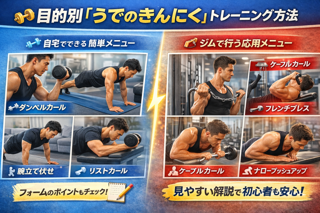 そんな声、多いですよね。うでのきんにくは、特別な環境がなくても刺激しやすい部位だと言われています。ここでは、自宅とジム、それぞれの目的に合わせたトレーニング方法とフォームのポイントを整理します。