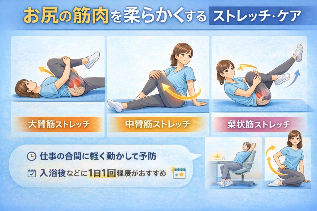 大臀筋は仰向けで膝を胸に引き寄せるストレッチ、中臀筋は座った姿勢で脚を組み体を前に倒す方法がよく紹介されています。