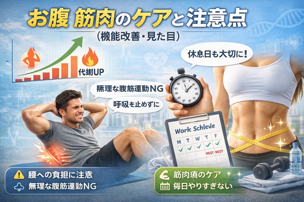 お腹 筋肉は鍛えることも大切ですが、同じくらい「ケア」と「注意点」を知っておくことが重要だと言われています。やみくもに腹筋運動を続けると、思わぬ不調につながるケースもあるため、体のサインを見ながら進める意識が欠かせません。ここでは、腰まわりへの配慮と、疲労をためにくい考え方を整理します。