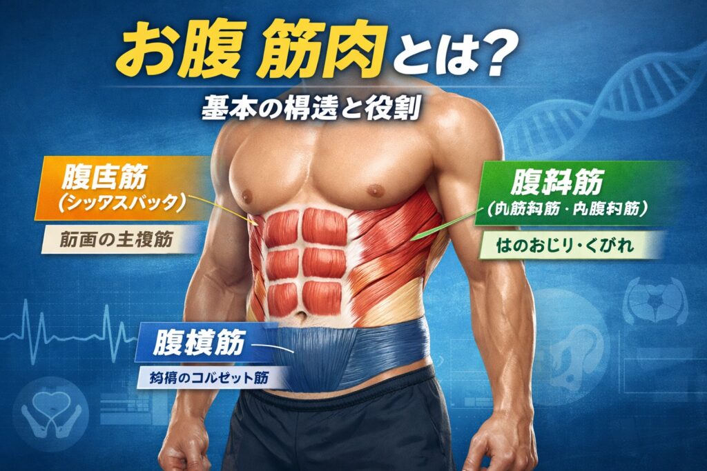 お腹 筋肉について、腹直筋・外腹斜筋・内腹斜筋・腹横筋の構造と働きを分かりやすく解説。役割やつけ方、基礎トレーニングまで丁寧に紹介します。