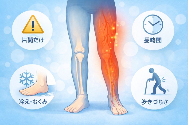 また、この血流の悪さが慢性的だったり、血管自体の壁が固くなるような疾患が背景にある場合には、しびれだけでなく「冷え」「むくみ」「だるさ」などが出ることもあるとされています。足立慶友整形外科+2池上みなみ内科+2