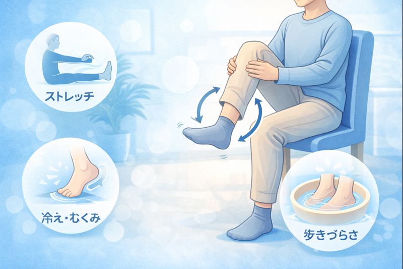 椅子に座った状態で足首をゆっくり回したり、立ち上がって軽く歩いてみてください。
