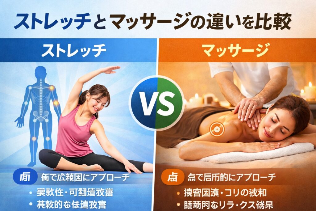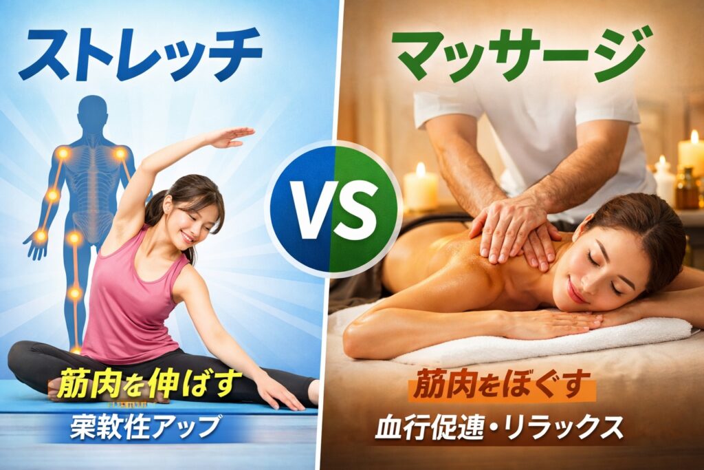 「ストレッチ マッサージ 違い」で検索すると、「結局どっちが良いの?」と迷っている人が多い印象です。