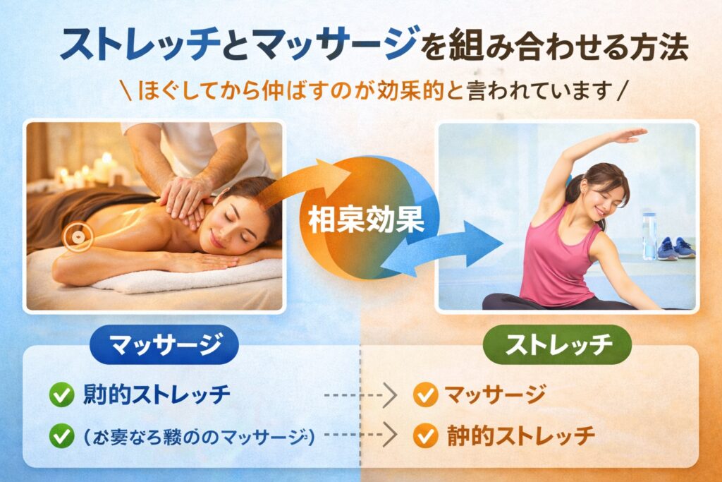 まずマッサージで筋肉のこりや緊張をやわらげ、その後にストレッチで筋肉を伸ばす流れです。