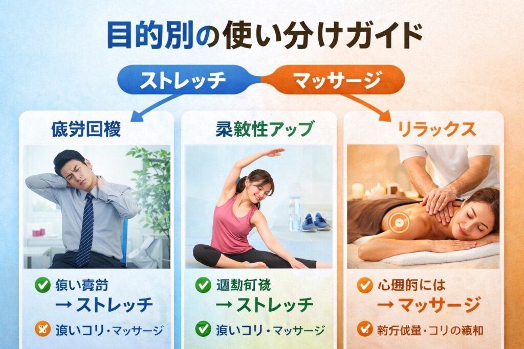 実は、ストレッチとマッサージは“優劣”で選ぶものではなく、「目的」で使い分ける考え方が大切だと言われています。