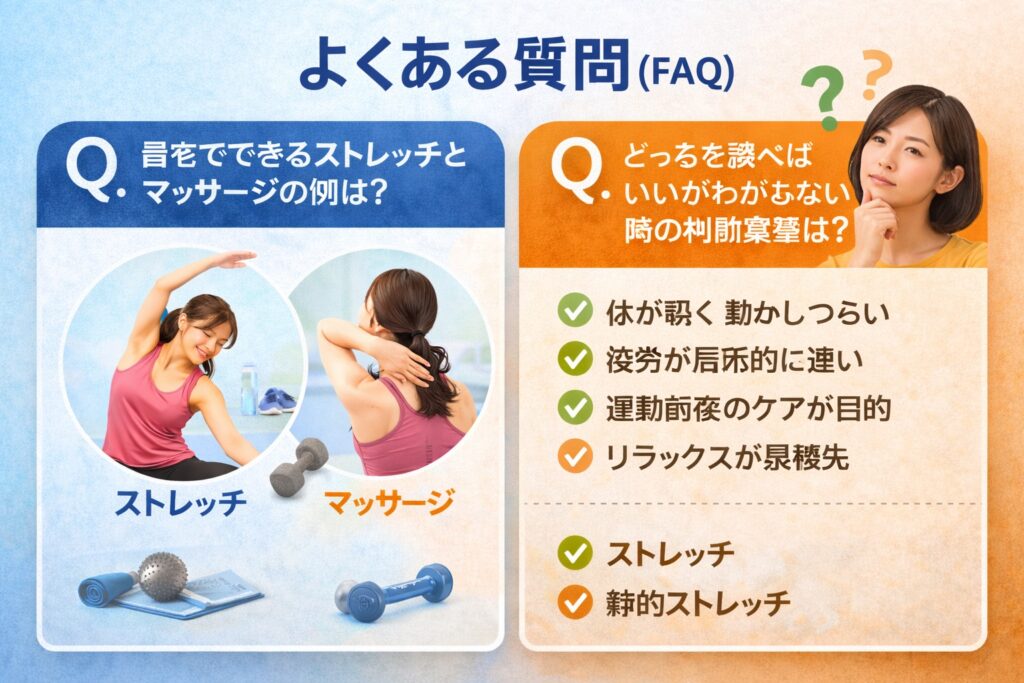 こうした疑問を一つずつ解消していくことで、ストレッチとマッサージを日常に取り入れやすくなります。