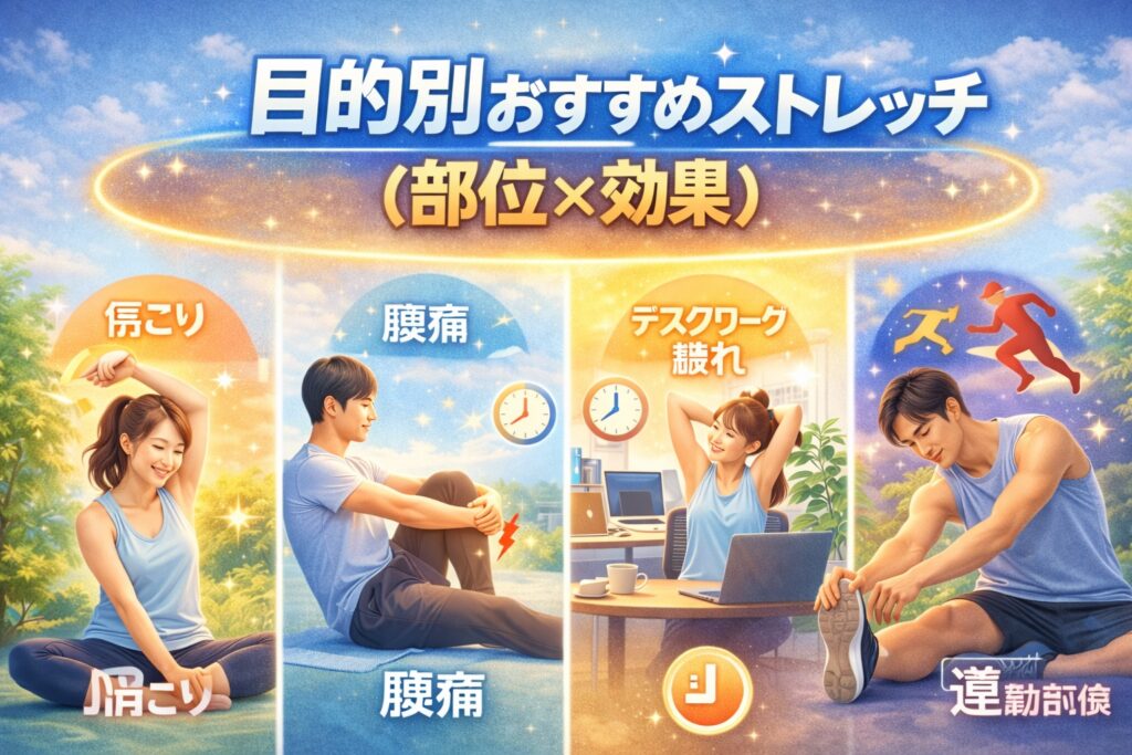 そう感じる方は多いですが、実は悩みや生活シーンによって意識したい部位は少しずつ違うと言われています。ここでは、代表的な悩み別におすすめされているストレッチの考え方を紹介します。