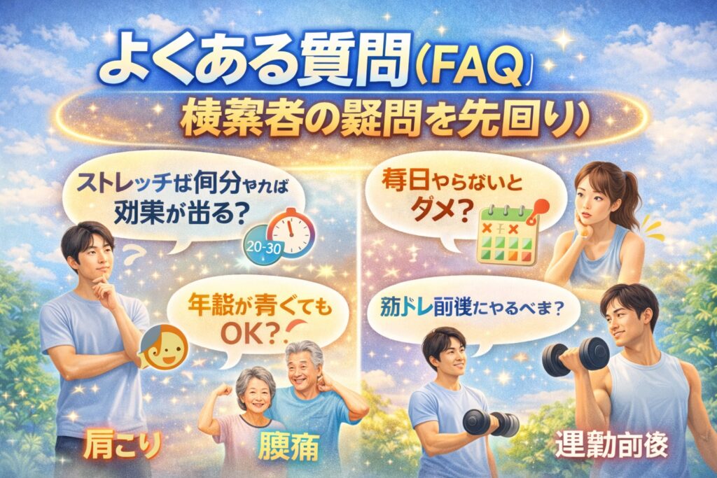 ストレッチについて調べていると、「結局どれくらいやればいいの?」「年齢的に大丈夫?」など、細かい疑問が次々に出てきますよね。ここでは、検索者が特に気にしやすい質問をQ&A形式で整理します。