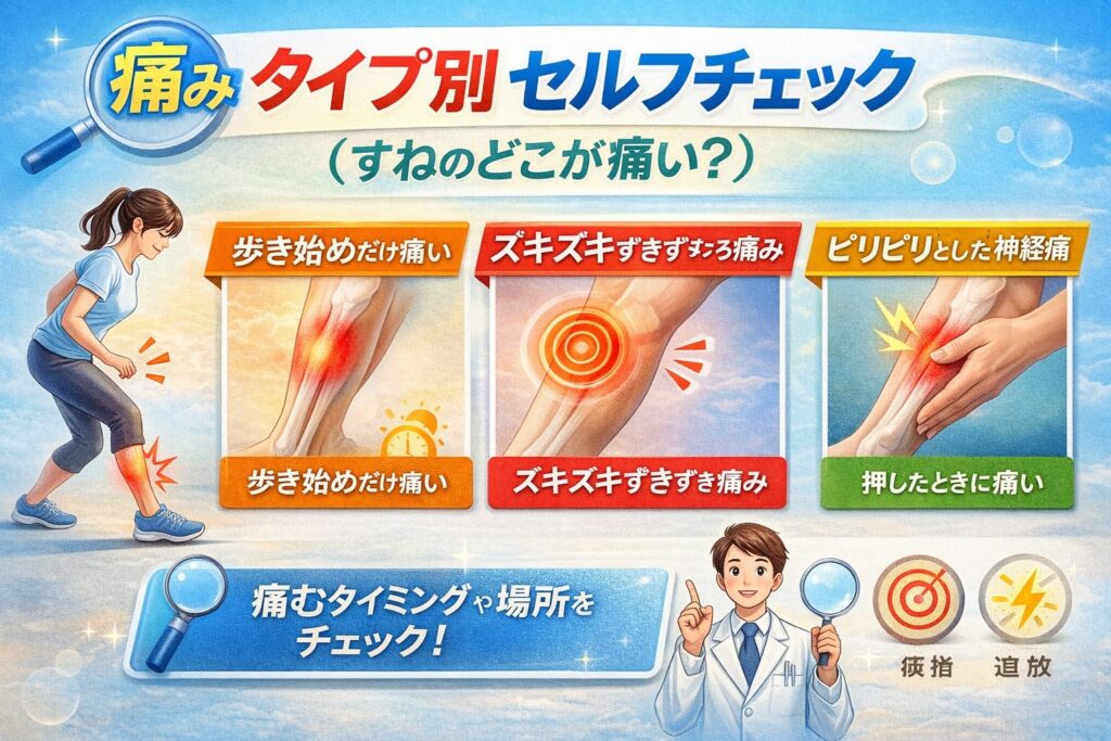 2.痛みのタイプ別セルフチェック(すねのどこが痛い?)
