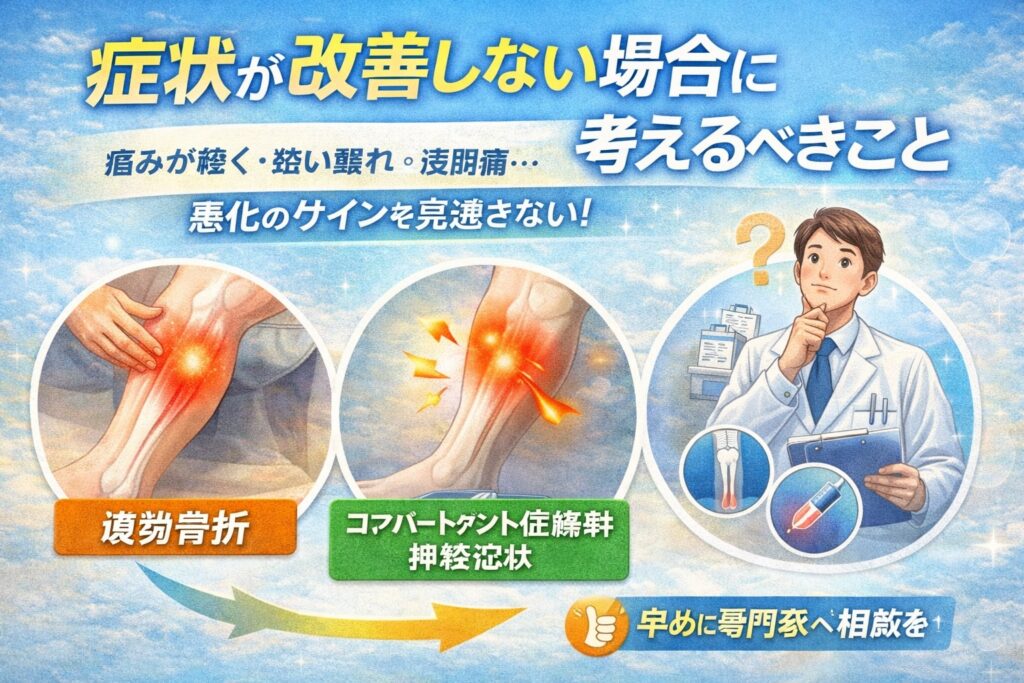 特に運動後に強い圧迫感が出たり、足先の感覚が鈍くなったりする場合は、早めに専門家へ相談したほうがよいとされています。