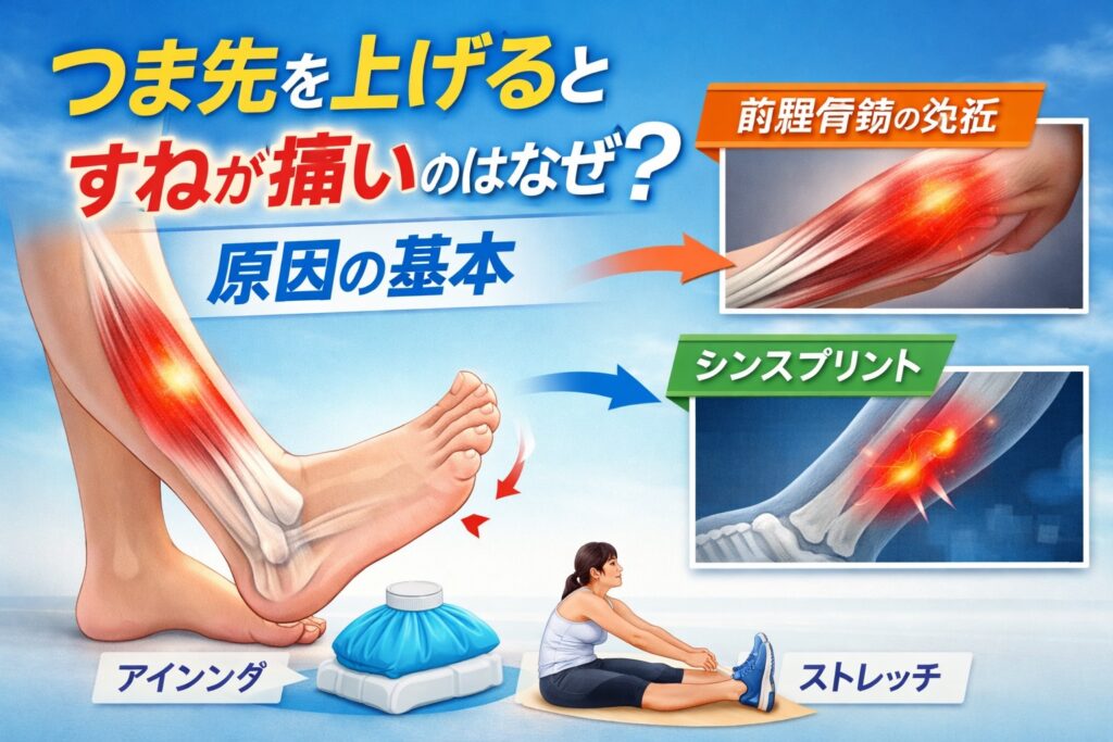 つま先を上げるとすねが痛い症状は、シンスプリントや前脛骨筋の使い過ぎが多い原因です。痛みの出方・部位ごとの違い・セルフチェック方法と自宅でできる対処法まで理学療法士監修の視点でわかりやすく解説します。