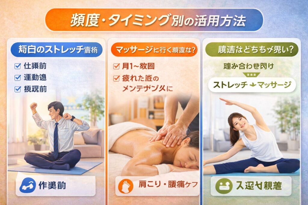 ストレッチやマッサージは、タイミングや回数によって感じ方が変わると言われています。ここでは、日常に取り入れやすい考え方を整理してみましょう。