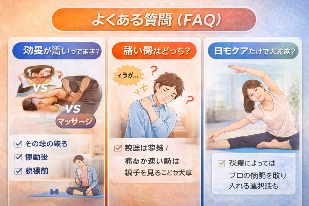 ここでは、「ストレッチとマッサージの違い」を調べている人から特によく聞かれる疑問について、ひとつずつ整理していきます。迷いやすいポイントなので、自分の状況と照らし合わせながら読んでみてください。