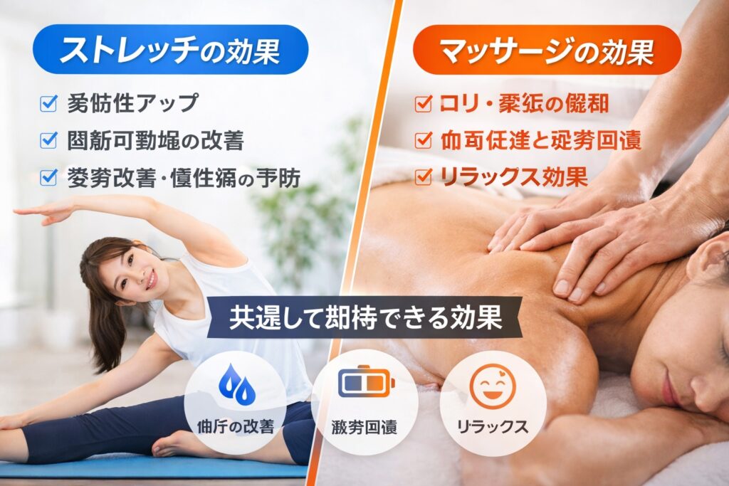 ストレッチとマッサージは方法こそ違いますが、共通して期待される効果もあります。