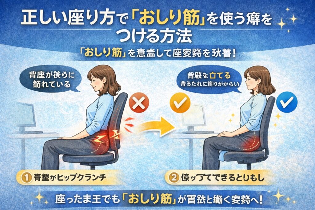 やり方はシンプルで、背筋を軽く伸ばし、おしりの筋肉を「ぎゅっ」と締めるだけ。息を止めず、自然な呼吸を意識するのがポイントです。
