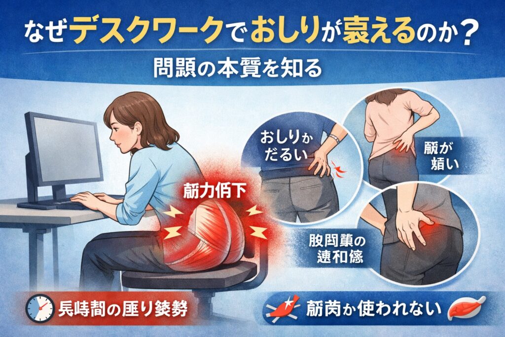 「座っているだけで、そんなに影響あるの?」と思うかもしれません。ですが、さかぐち整骨院の解説でも、同じ姿勢が続くことで筋肉が硬くなり、コリや違和感につながるケースがあると言われています。特にデスクワークでは、骨盤が後ろに倒れやすく、おしりの筋肉が“サボった状態”になりやすい点も注意が必要です。