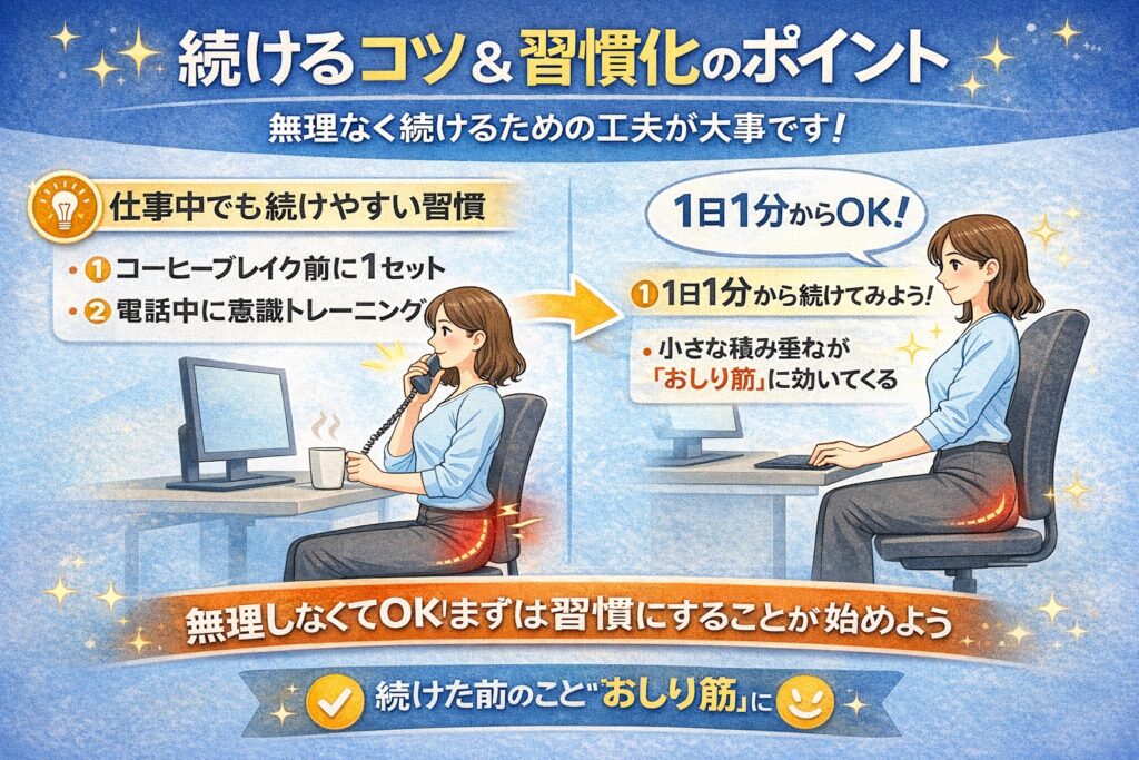 たとえば、コーヒーブレイクの前に1セットだけおしりを締める動きを入れてみる。これなら「何かのついで」にできるため、心理的なハードルが下がりやすいと考えられています。