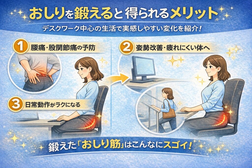 そう思っている方も多いかもしれません。実は、おしりの筋肉は体を支える土台のような存在で、日常のさまざまな動きに関わっていると言われています。ここでは、デスクワーク中心の生活で感じやすい変化を中心に、メリットを見ていきましょう。