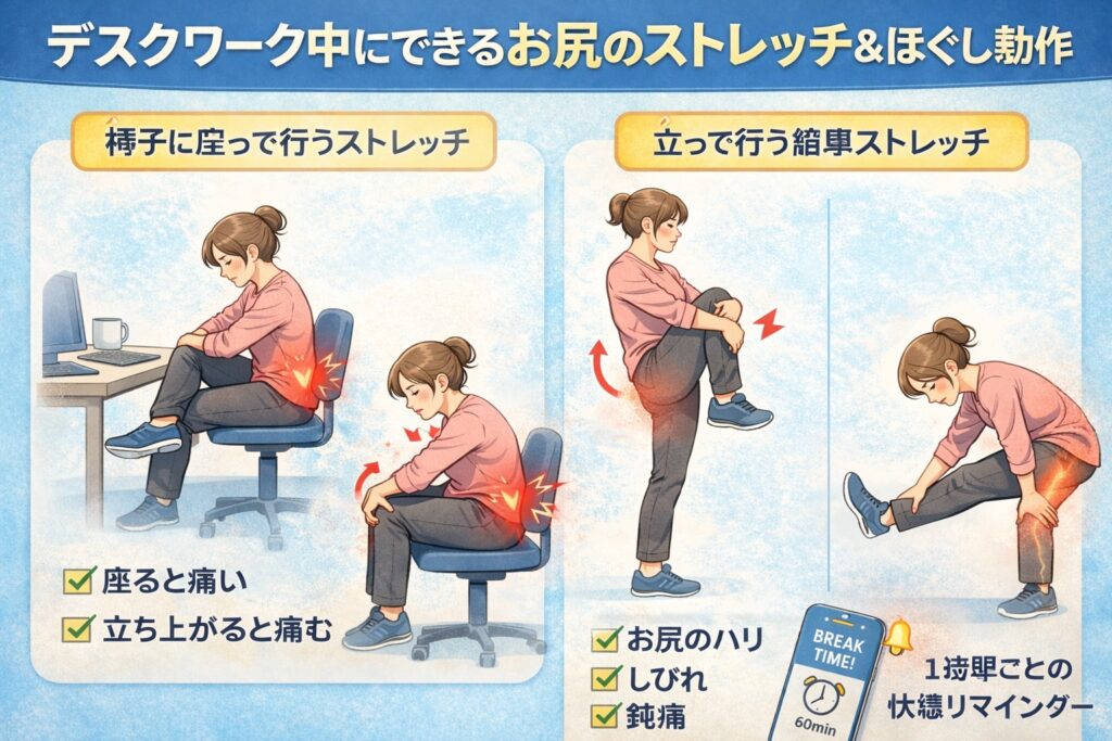 そんな人でも取り入れやすいのが、デスクワーク中にできるお尻ストレッチです。ここでは、座ったまま・立ち上がってすぐできる動きを中心に紹介します。