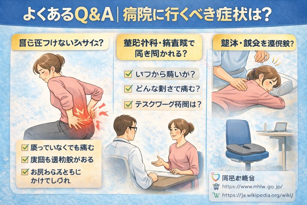 デスクワーク中のお尻の違和感は、判断に迷いやすいですよね。ここでは、来院を考える目安をQ&A形式で整理します。