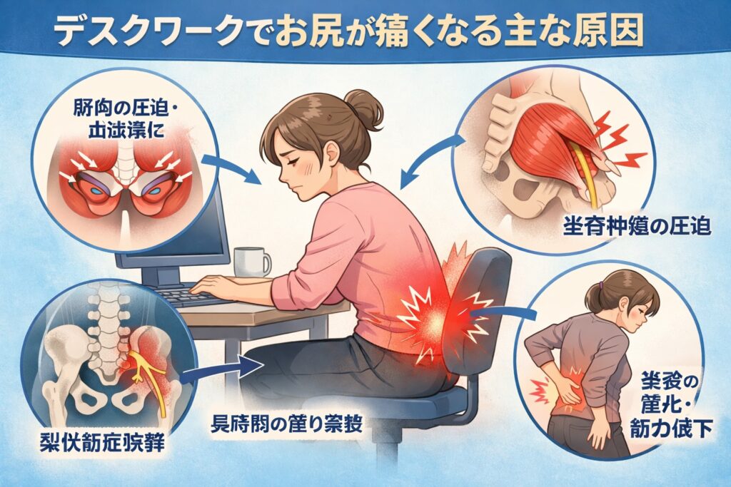 デスクワーク お尻の痛み・こり対策を徹底解説! 長時間座ることで起こるお尻の不調の原因から、簡単にできるストレッチ・筋力アップ・姿勢改善まで、デスクワーカー必見の対策情報をまとめています。