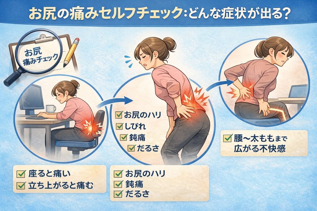 こうした感覚、意外と多いです。ここではデスクワーク中に出やすいお尻の症状を整理しながら、セルフチェックの目安を見ていきましょう。