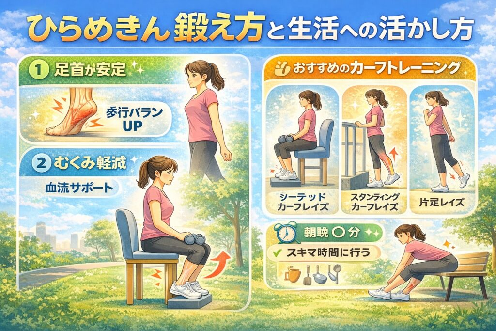 そんな疑問を持つ方も多いかもしれません。ヒラメ筋はケアだけでなく、適度に鍛えることで日常動作を支えやすくなると言われています。ここでは、ヒラメ筋トレーニングのメリットと、続けやすい方法を整理して紹介します。