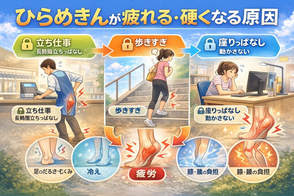 そんな悩みを感じたことはありませんか?実はその不調、ひらめきん(ヒラメ筋)の疲労や硬さが関係している可能性があると言われています。ここでは、日常生活の中でヒラメ筋に負担がかかる理由と、そこから起こりやすい不調について整理していきます。