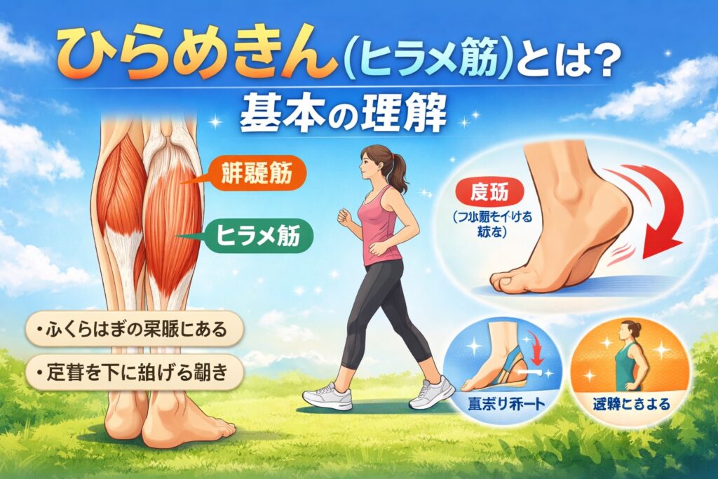 ひらめきん(ヒラメ筋)はふくらはぎの深層にある重要な筋肉です。働き・疲労の原因・むくみ対策・ストレッチ&鍛え方まで、理学療法士監修レベルで分かりやすく解説します。
