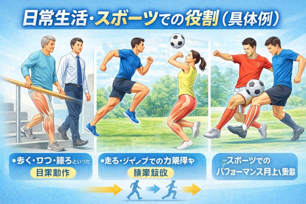 そんなふうに思われがちですが、実は日常生活でもかなり出番が多い筋肉だと言われています。ここでは「自分の動きとどう関係しているのか」をイメージしながら見ていきましょう。