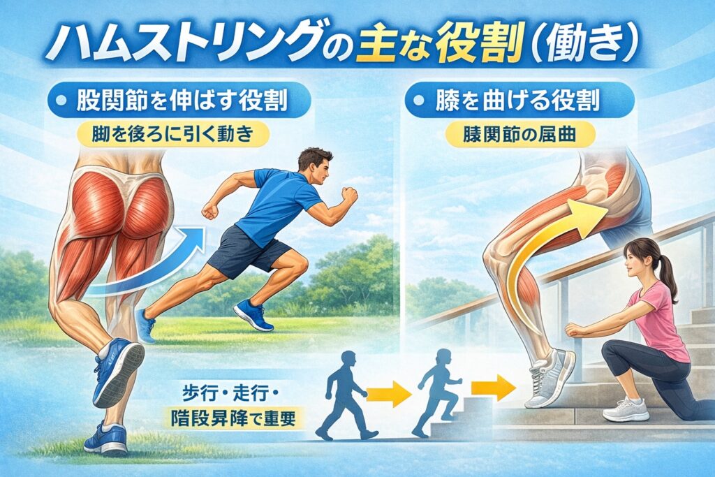 こう聞かれることは少なくありません。専門用語だけを見ると難しく感じますが、実は日常の動きとかなり密接に関わっている筋肉だと言われています。ハムストリングの主な役割は、大きく分けて「股関節を伸ばす動き」と「膝を曲げる動き」。この2つを押さえると、ぐっと理解しやすくなります。