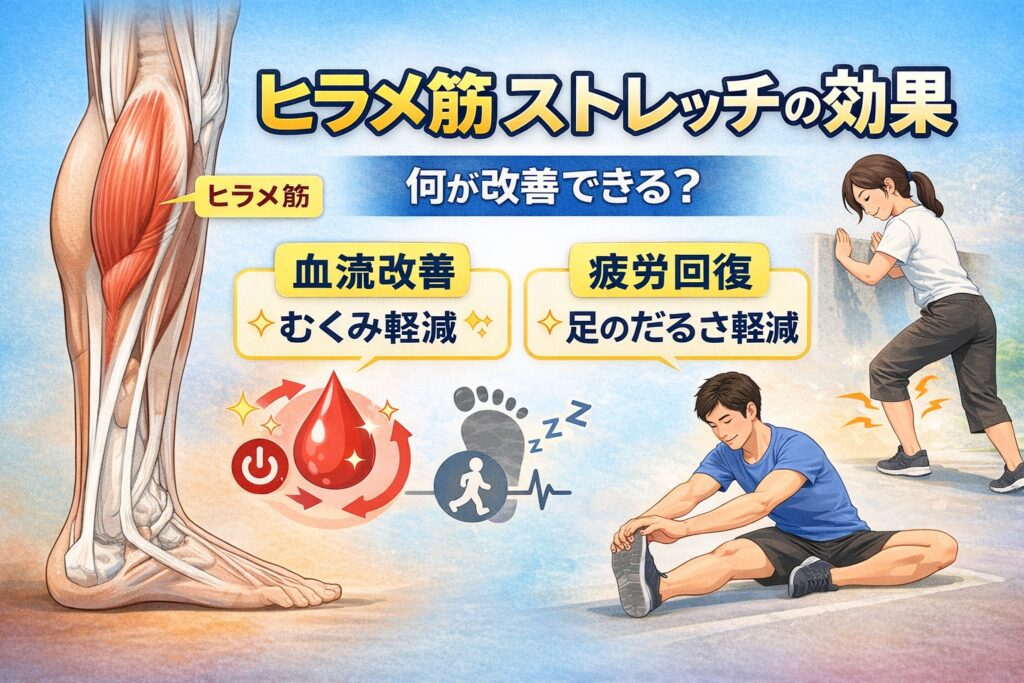 そんな疑問を持つ人は多いと思います。結論から言うと、ヒラメ筋をやさしく伸ばすことで、血流や疲労感に良い影響が出る可能性があると言われています。ここでは、代表的な2つの効果について整理してみましょう。