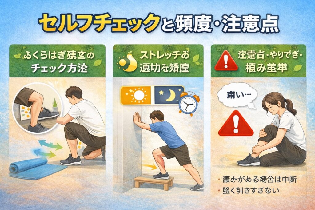 「効かせたいから強めに…」と思いがちですが、ヒラメ筋ストレッチは“じんわり”を目安に行うのが基本とされています。体の声を聞きながら調整することが、安全に続けるポイントと言えそうですね。
