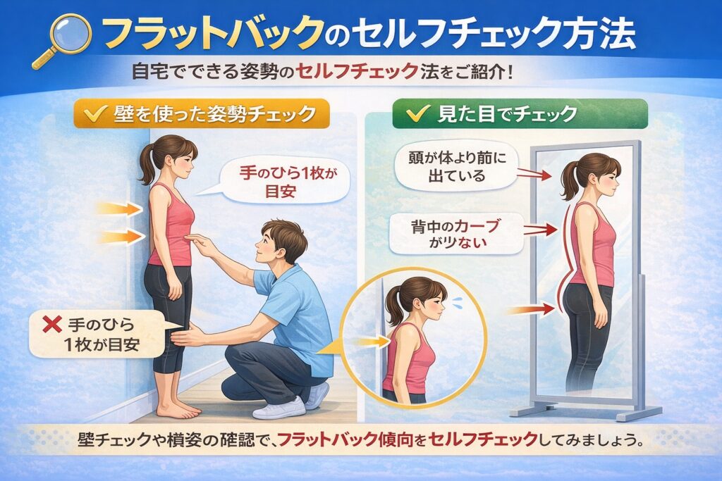 フラットバックは、鏡で横から体を見ると気づきやすい姿勢です。たとえば、