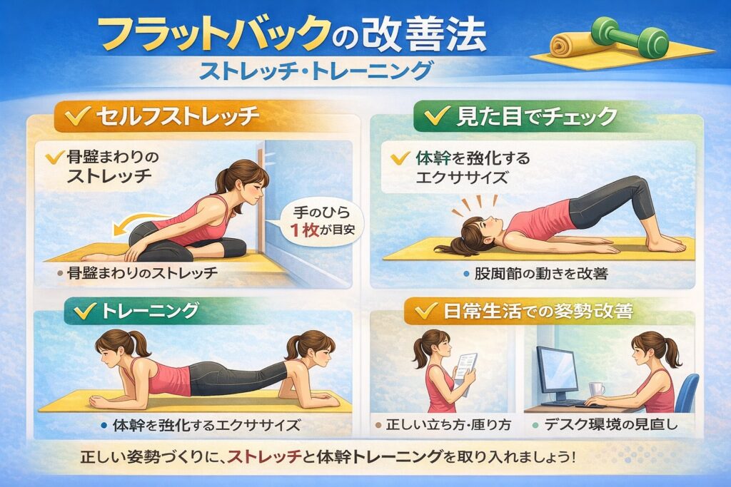 無理に姿勢を正そうとするより、「今の状態を知る」ことが、フラットバック改善への第一歩につながると考えられています。