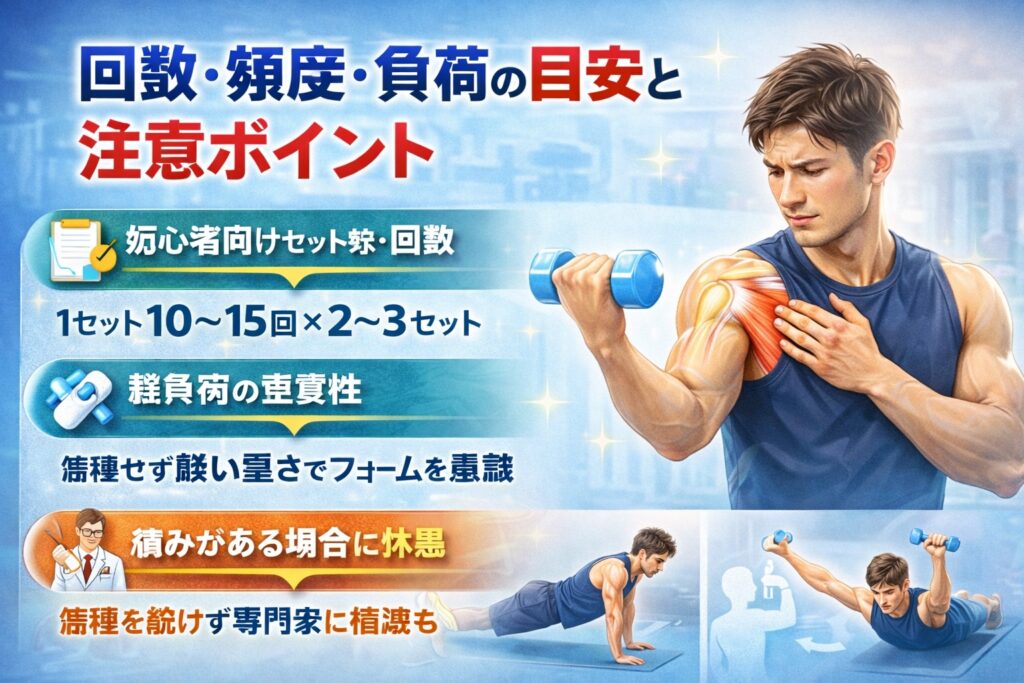 回数や重さを間違えると、かえって肩に負担がかかることもあると言われています。ここでは、初心者でも取り組みやすい目安と注意ポイントを整理していきます。