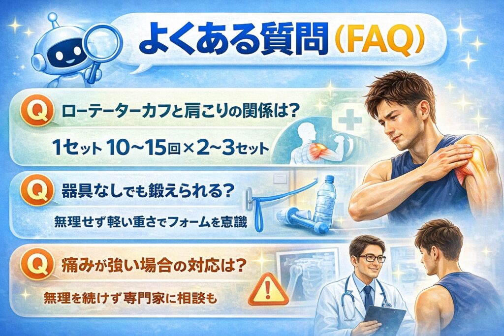 ローテーターカフの筋トレについて調べていると、「これって肩こりにも関係ある?」「道具がなくても大丈夫?」など、細かい疑問が次々に出てきますよね。