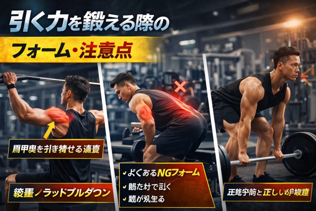 引く力 筋トレは、種目選びと同じくらいフォームの意識が重要だと言われています。正しく動けているつもりでも、少しのズレで効き方が変わったり、体に負担がかかりやすくなったりすることもあるようです。ここでは、初心者が特に押さえておきたいフォームのポイントと注意点を整理します。