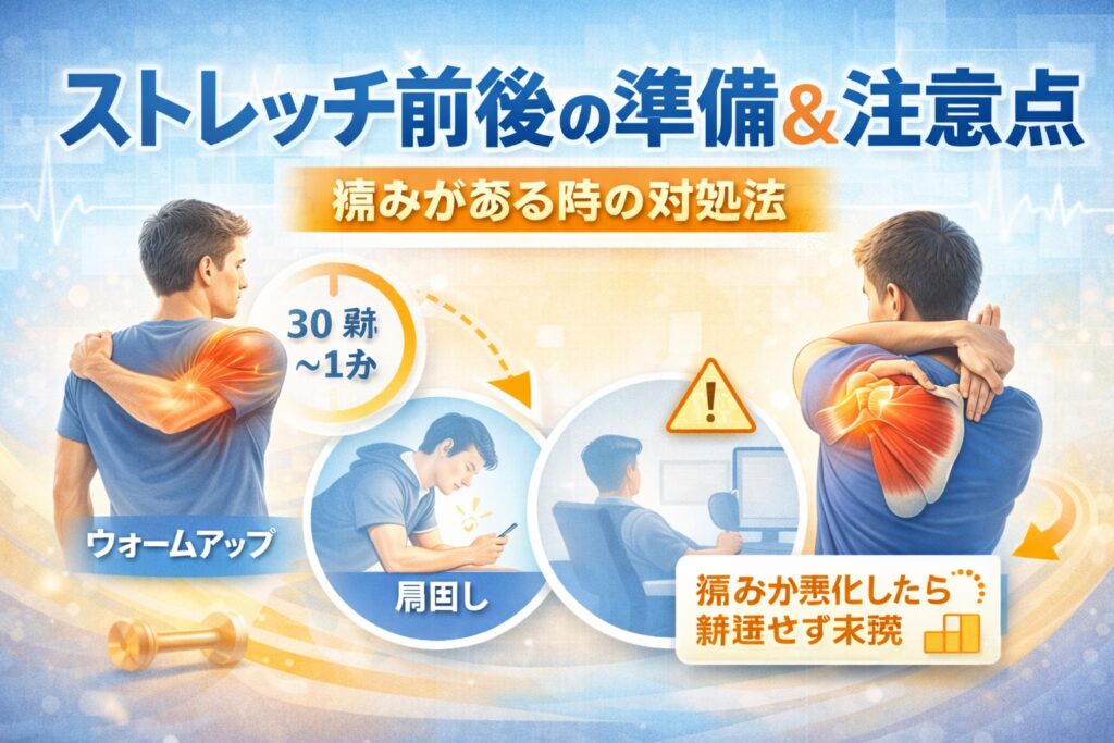 そう感じる方も少なくありません。回旋筋腱板ストレッチは、準備とアフターケアを意識することで、より安全に行いやすくなると言われています。ここでは、始める前後に押さえておきたいポイントを整理します。