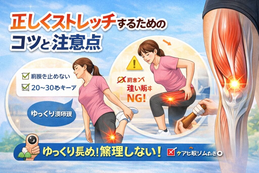 そんなときは、やり方やタイミングが合っていない可能性があると言われています。外側広筋のストレッチは、力任せに伸ばすよりも、体の反応を感じ取りながら行うことが大切なポイントです。ここでは、見落としがちなコツと注意点を整理します。