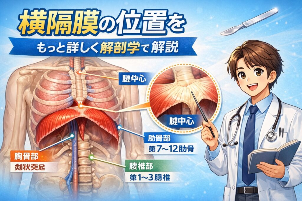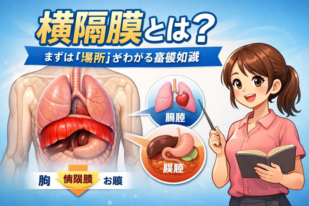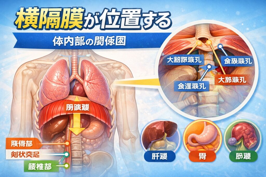 横隔膜 場所を徹底解説|横隔膜は胸とお腹の境目にあるドーム状の筋肉で、肋骨下部・肺の真下・内臓の上に位置します。構造・役割・周辺の器官との関係まで図解とともに初心者でもわかるようにまとめました。