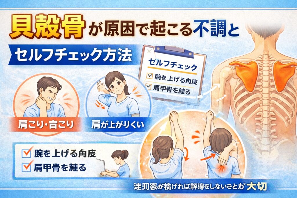 そんなとき、実は貝殻骨(肩甲骨)の動きが関係している可能性があると言われています。肩甲骨は、肩や首の筋肉と密接につながっているため、動きが悪くなると不調を感じやすくなるようです。ここでは、よくある不調と簡単にできるセルフチェック方法を見ていきましょう。