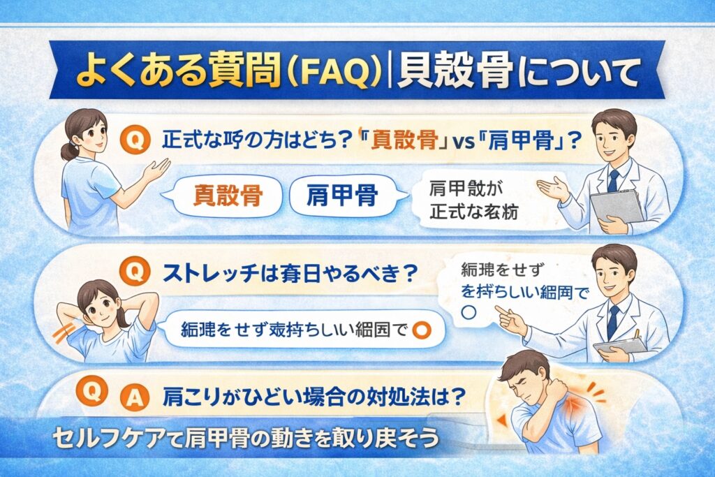 実はこの貝殻骨、医学用語ではなく、日常会話や施術現場などで使われる肩甲骨の呼び方のひとつと言われています。ここでは、貝殻骨の意味や由来、体のどこにあるのかを、会話形式でわかりやすく整理していきます。
