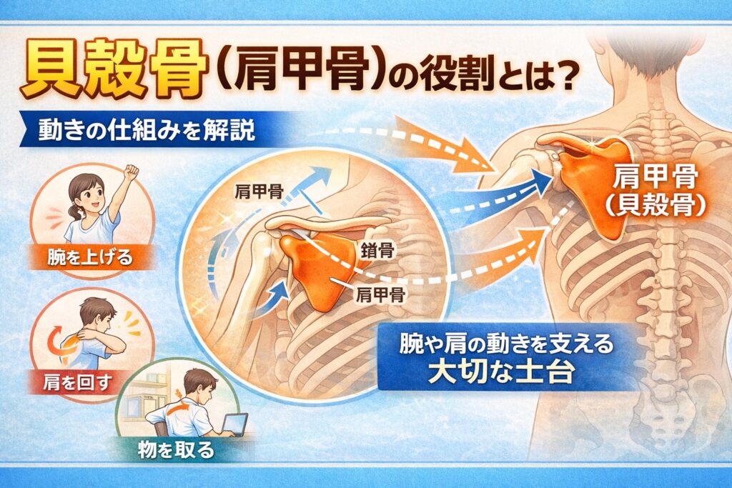 そう聞かれることがありますが、実は肩や腕を動かすうえで、かなり重要な役割を担っていると言われています。見た目は背中側にひっそりありますが、動きの司令塔のような存在です。ここでは、貝殻骨(肩甲骨)がどんな働きをしているのか、動きや姿勢との関係を含めて見ていきましょう。