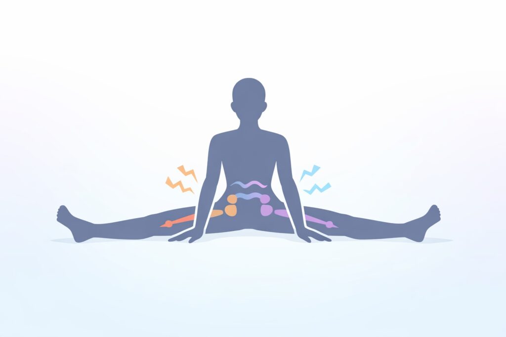 「脚を横に開こうとしても途中で止まる…」という場合、関節そのものより、周囲の筋肉がブレーキをかけているケースが多いと言われています。特に内ももやお尻まわりの緊張が強いと、可動域が出づらくなる傾向があるようです。